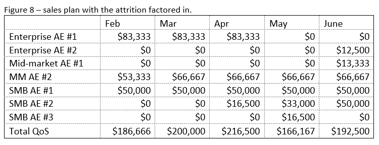 NA: Now we have all the elements in place necessary to create the sales plan. As an investor, one the key metrics I pay attention to is the amount of quota on the street.
