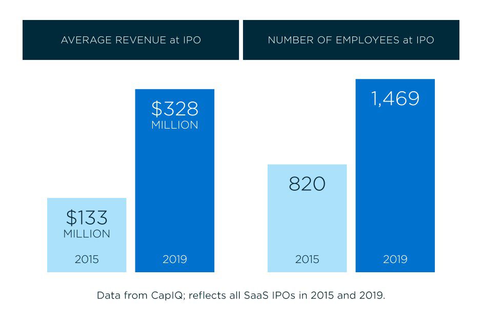 The data really tells the story here. According to a Battery analysis of all SaaS IPOs since we published our T2D3 piece, using data from CapIQ, the average revenue at the time of IPO has skyrocketed for these companies to $328 million this year, up from $133 million in 2015. The number of employees at IPO has also risen significantly–to 1,469 from 820.