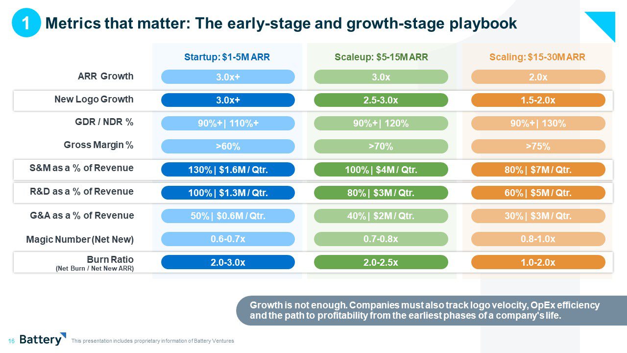 Starting from the top line, we recommend that early-stage and growth-stage software companies focus closely on logo velocity. We know that as companies mature, they rely on expansion revenue to drive growth. However, logo velocity helps to ensure that there is a large enough customer base to fuel future growth, but also aligns sales to balance new ARR and expansion ARR from day one.