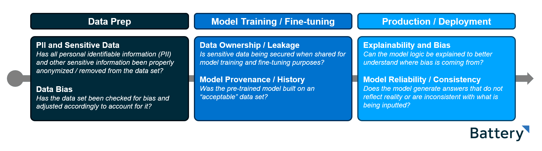 At Battery, we break down the ML lifecycle into three discrete steps, each with its own set of compliance and governance risks: