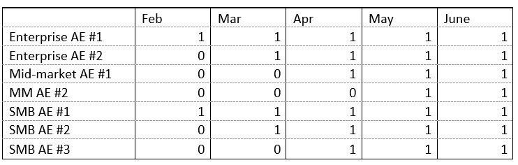 BB: Build a spreadsheet with rows for your different types of quota-carrying reps and the number of those reps you plan to hire. This can be by segment, by geography, by vertical of the different types of AE’s you have. The goal is to determine how fast you’ll get quota onto the street to be able to make your plan.