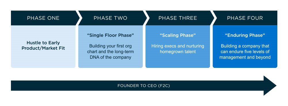 So in addition to T2D3, my firm and I are now focusing on another founder journey: F2C, or the transition from founder/CEO to CEO/founder. This journey can take many paths, but ideally it starts with the traditional hustle to find early product/market fit. Then, founders should start morphing into real CEOs by focusing on building their first org chart and establishing the core cultural DNA of the company; hiring talented senior executives and nurturing homegrown talent; and, finally, building a mature company that can support five levels of management and even more levels in the future.