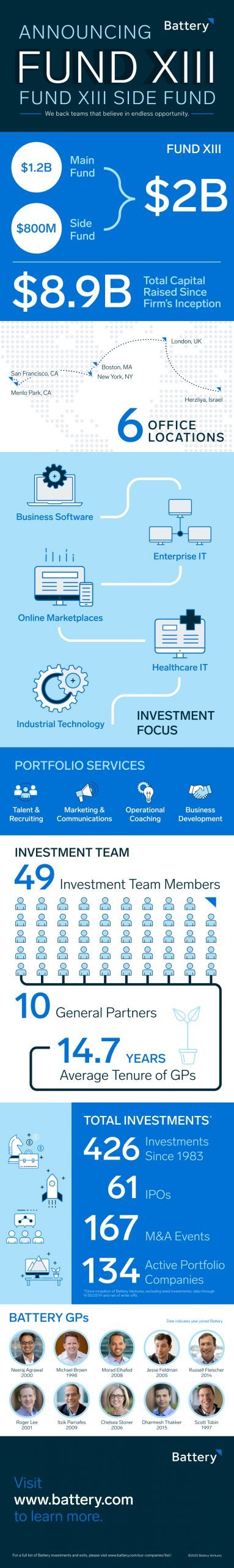 Today, global investment firm Battery Ventures announces its thirteenth family of funds, Battery Ventures XIII and XIII Side Fund, capitalized at a combined $2 billion. It represents the firm’s largest-ever fundraise. But the investing strategy behind the new funds has stayed much the same over the past decades.