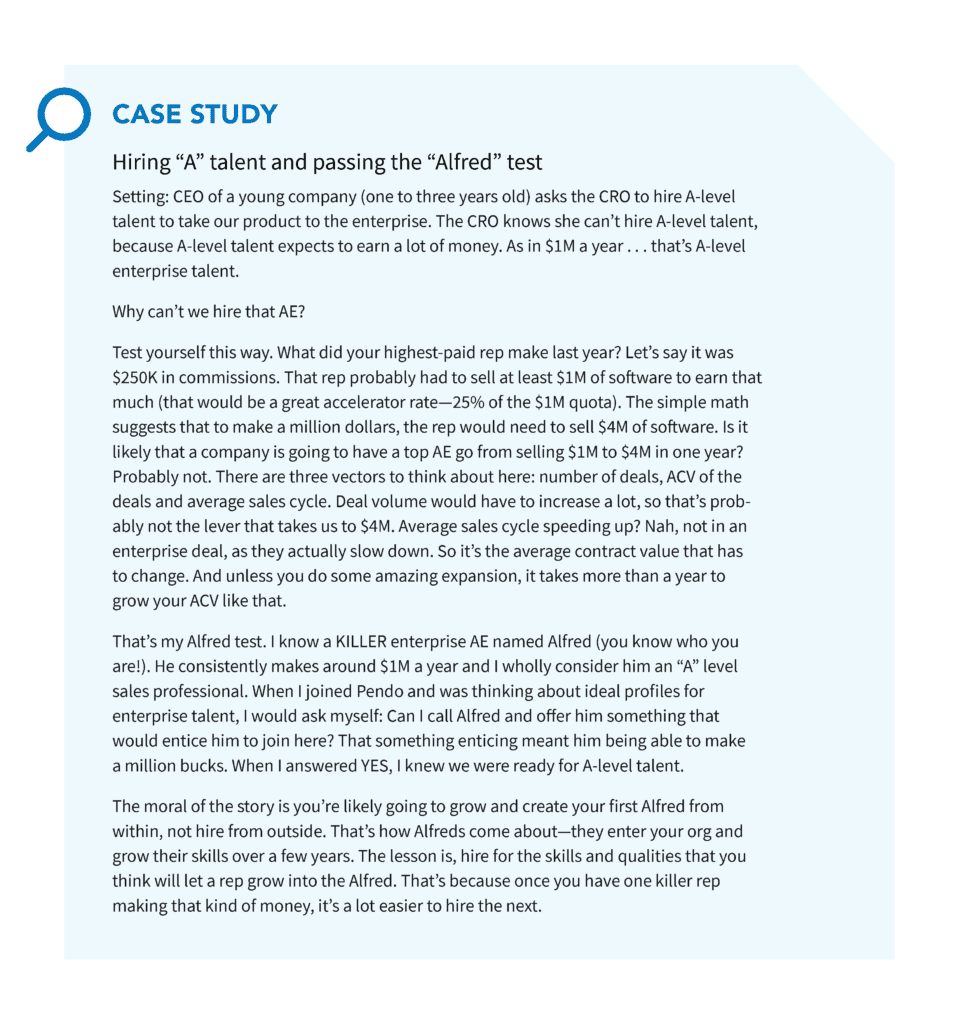 Let’s say you’re gaining momentum in selling to the enterprise and hire a recruiter to help you get enterprise-sales talent. In your first interview with a promising-looking AE, she asks: